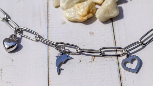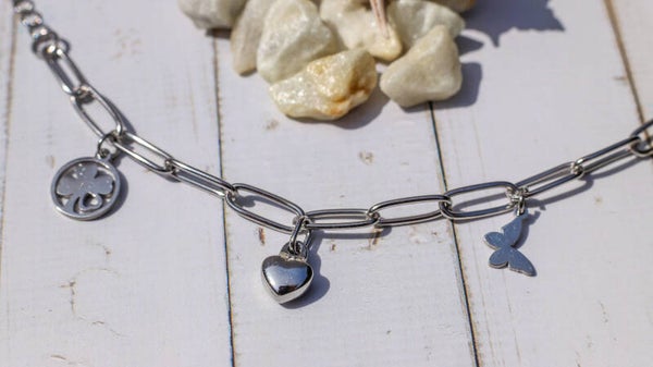 Vrolijke bedelarmband met 5 bedels aan een paperclip schakel stainless steel.