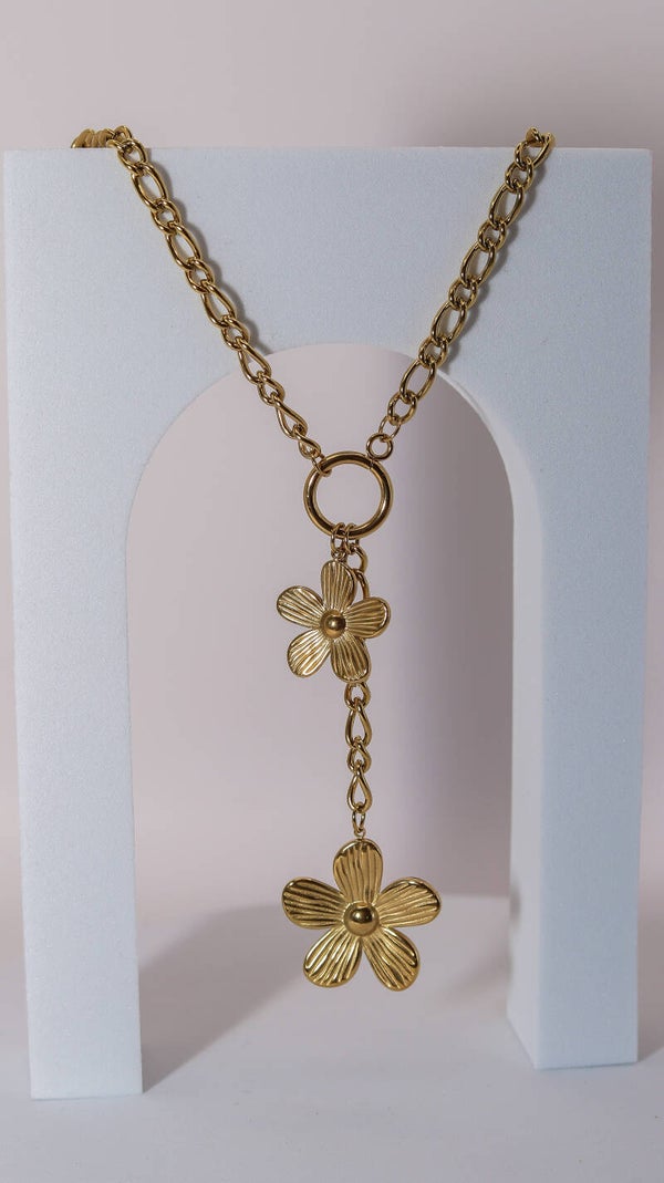 Trendy ketting met dubbele bloem hanger. Goudkleurig stainless steel.