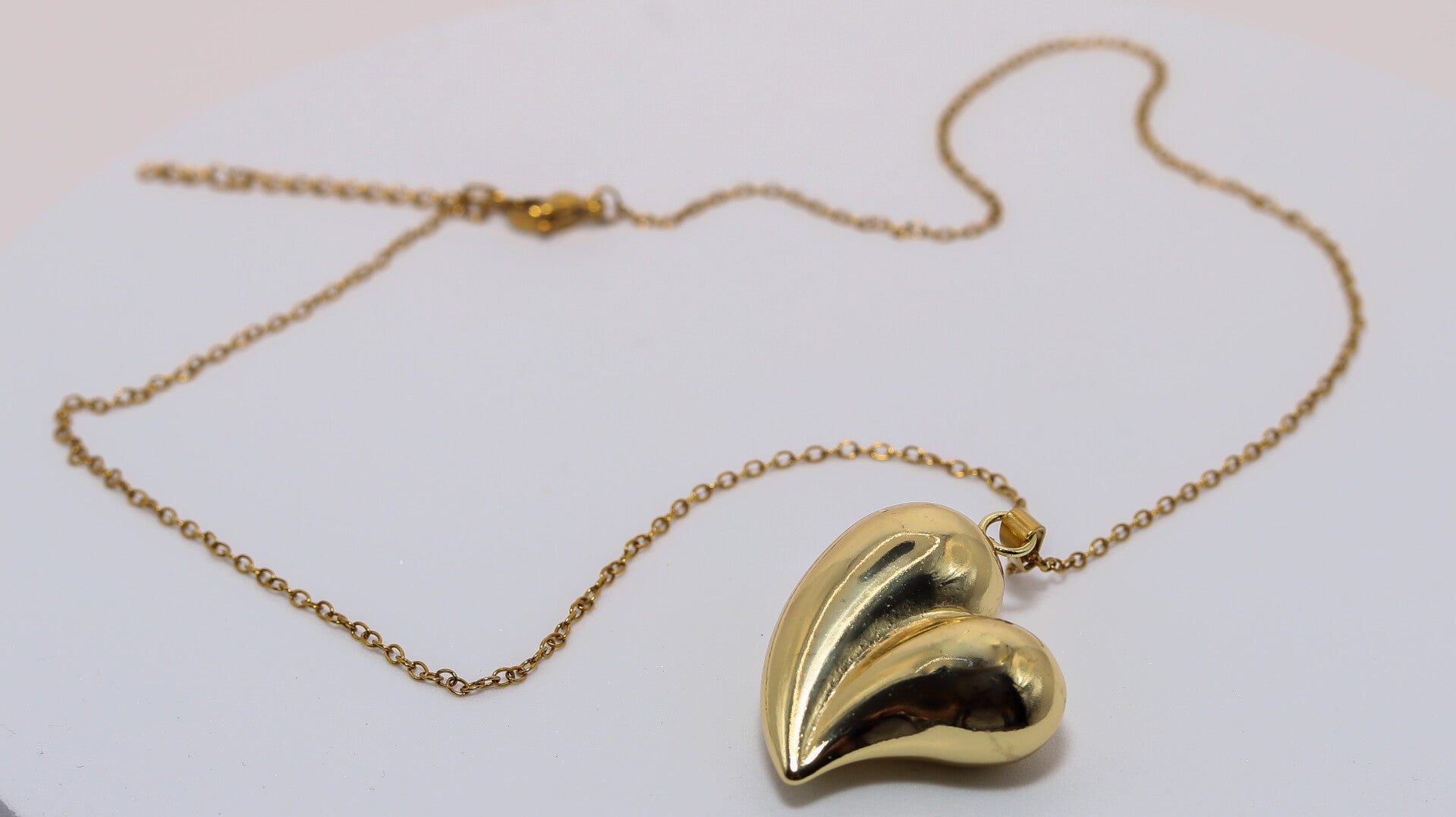 Prachtige fijne schakelketting met groot 3D hart. Goudkleurig stainless steel.
