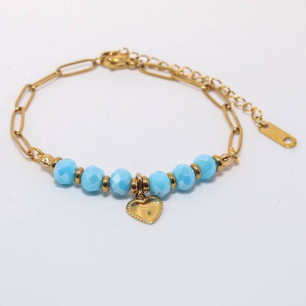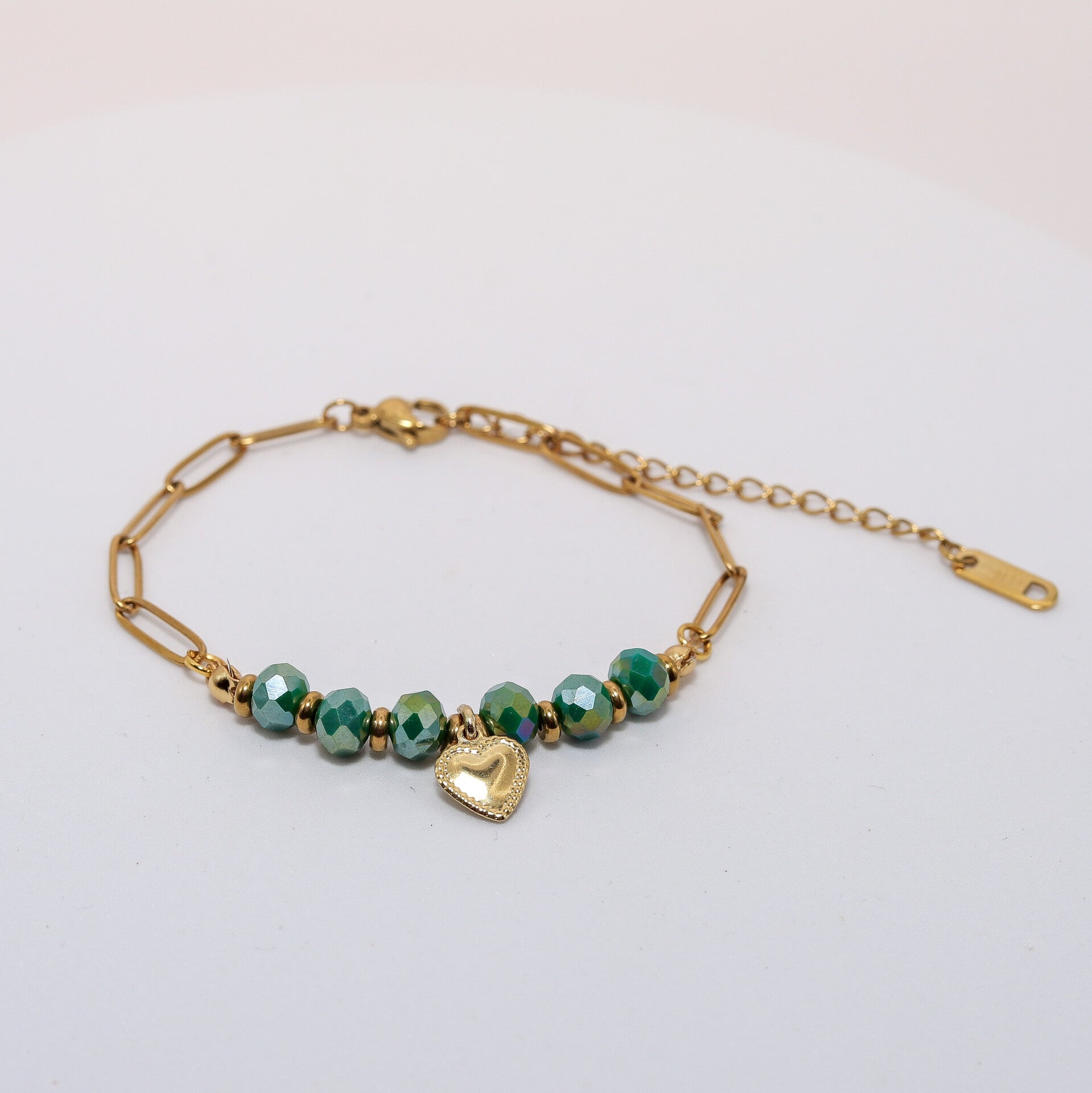 Mooie combinatie van goudkleurig stainless steel en glaskralen.