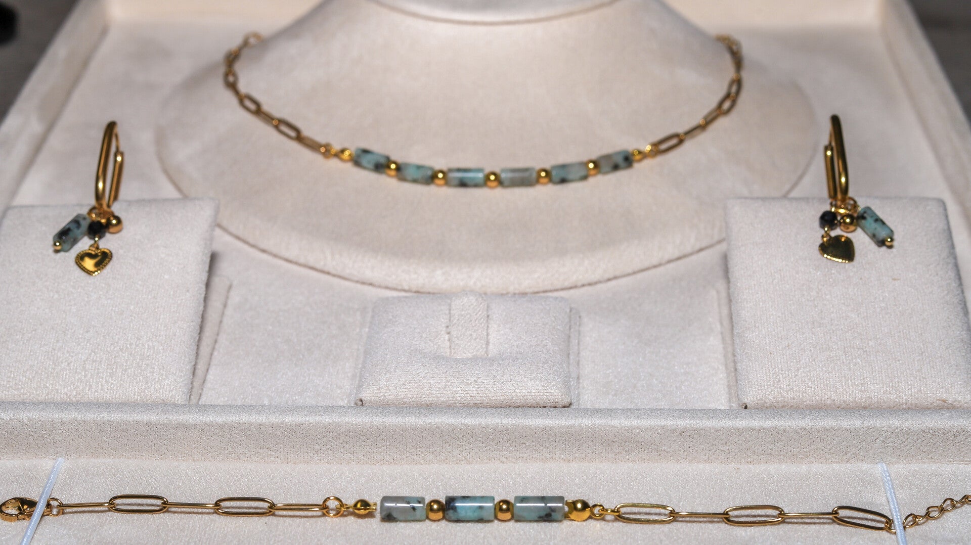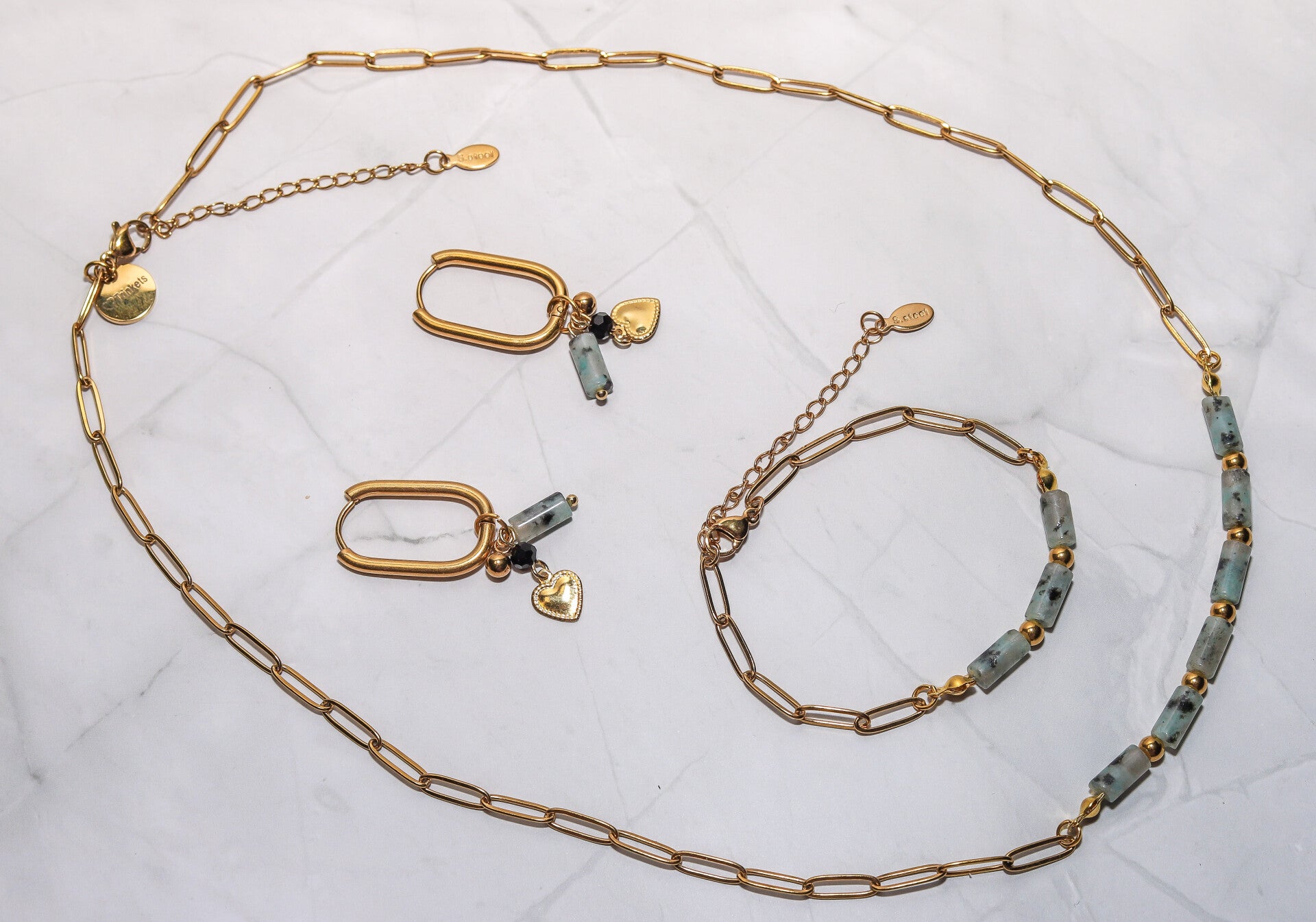 Stainless steel armband met natuurstenen cilinder kralen. In goud of zilver