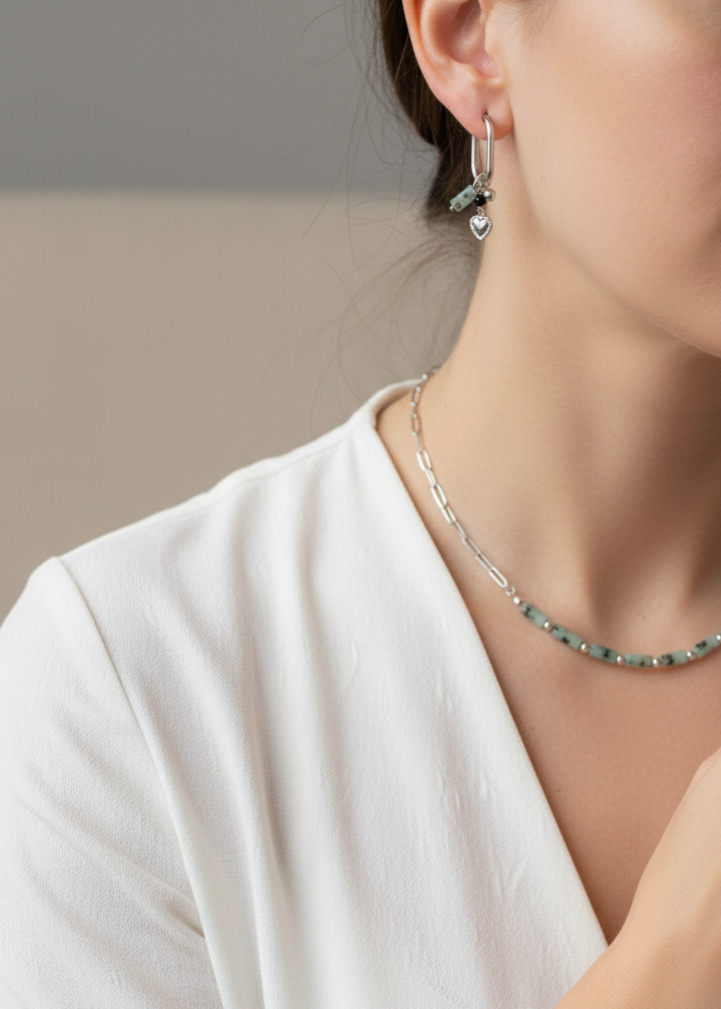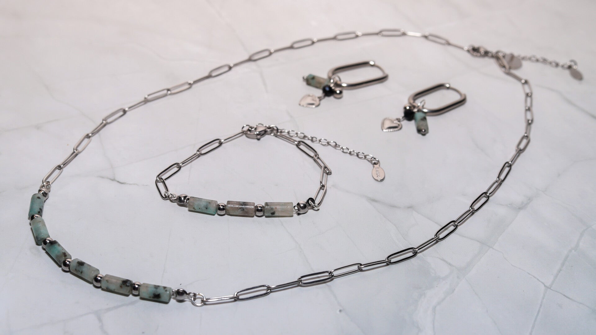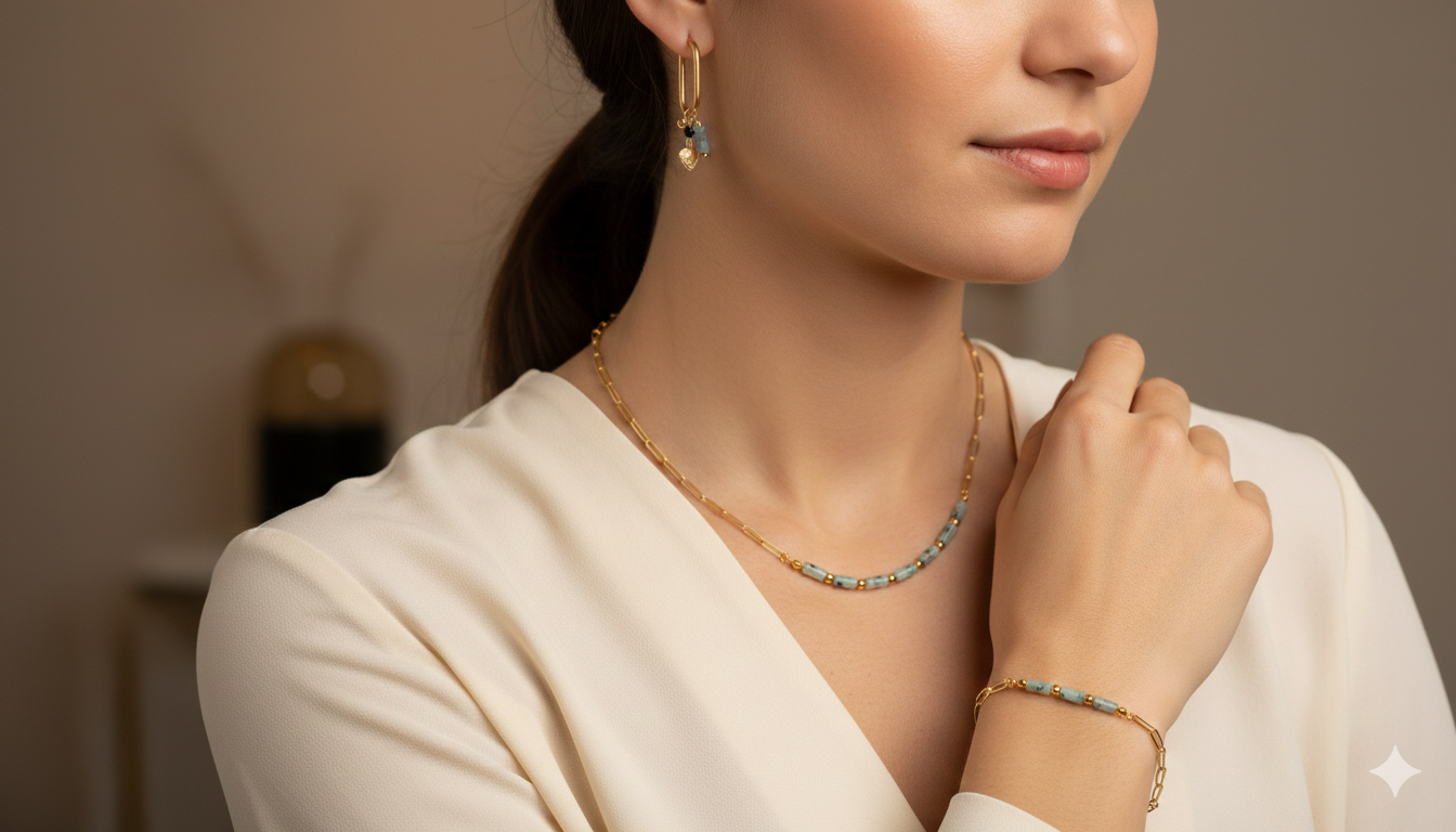 Stainless steel ketting met cilinder vormige natuursteen kralen in zilver en goudkleurig.